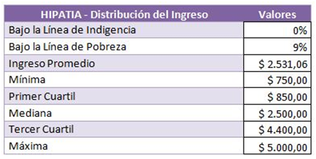 El nivel socio económico de Hipatia, es medio. Casi no se registran desocupados, y la mayoría de los hogares encuestados se encuentra por encima de la línea de pobreza (91% hogares relevados).