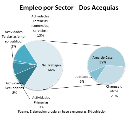 El segundo grupo etario en número es el de los adultos en edad productiva. La mayoría de ellos se emplean en changas y trabajan en fincas, hay pocos artesanos y productores y algunos emprendedores. En general, el grado de emprendedorismo es bajo. Algunos habitantes tienen comercios para satisfacer necesidades básicas de la comunidad como es el caso de aquellos que cuentan con carnicerías o kioscos.  Entre un 10 y un 15% se emplean en actividades primarias o empleos públicos, mientras que los jubilados y amas de casa suman más de un 40% de la población mayor de 18 años.