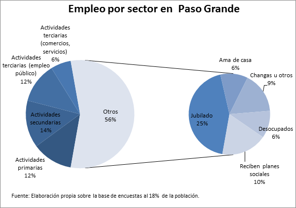 Por otro lado se observa que entre las actividades terciarias, el empleo público (12%), y las actividades primarias (12%) representan un 24 % de la población económicamente activa. Esta última caracterizada por la informalidad en su forma de contratación. Un número no menor lo constituyen quienes reciben planes sociales 10%, el Plan de Inclusión de carácter provincial se asigna a quienes no logran conseguir un trabajo estable, y desarrollan tareas tales como mantenimiento, limpieza y cuidado del pueblo y otros forman parte de la seguridad comunitaria, de carácter municipal. Un 21% está compuesto por quienes realizan changas (9%), amas de casa (6%) y los desocupados (6%). La denominada población económicamente inactiva contiene un número significativo, nucleando un 25% del total de los encuestados.